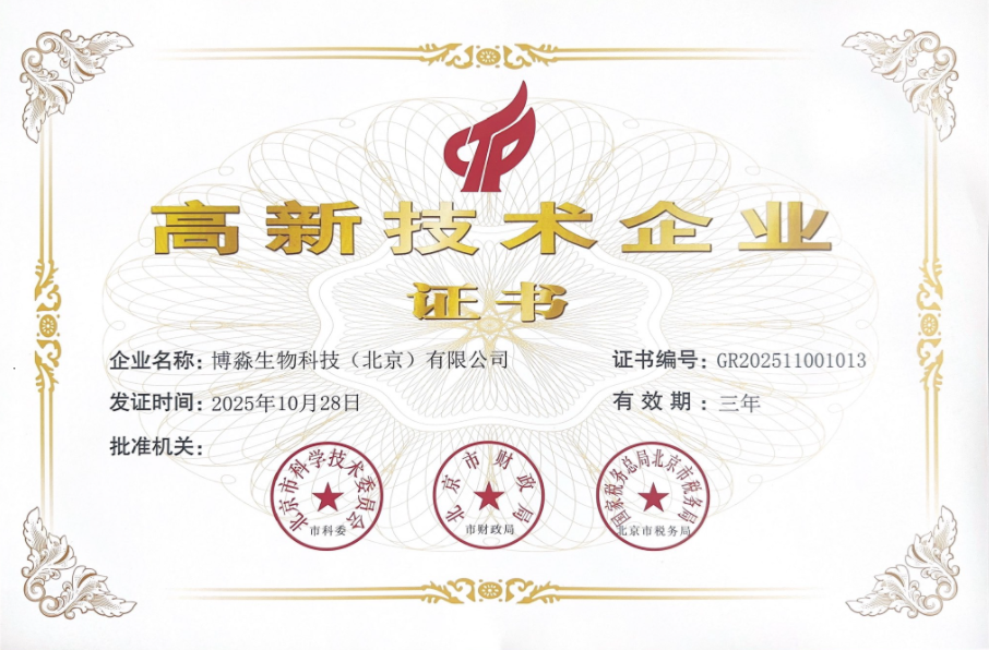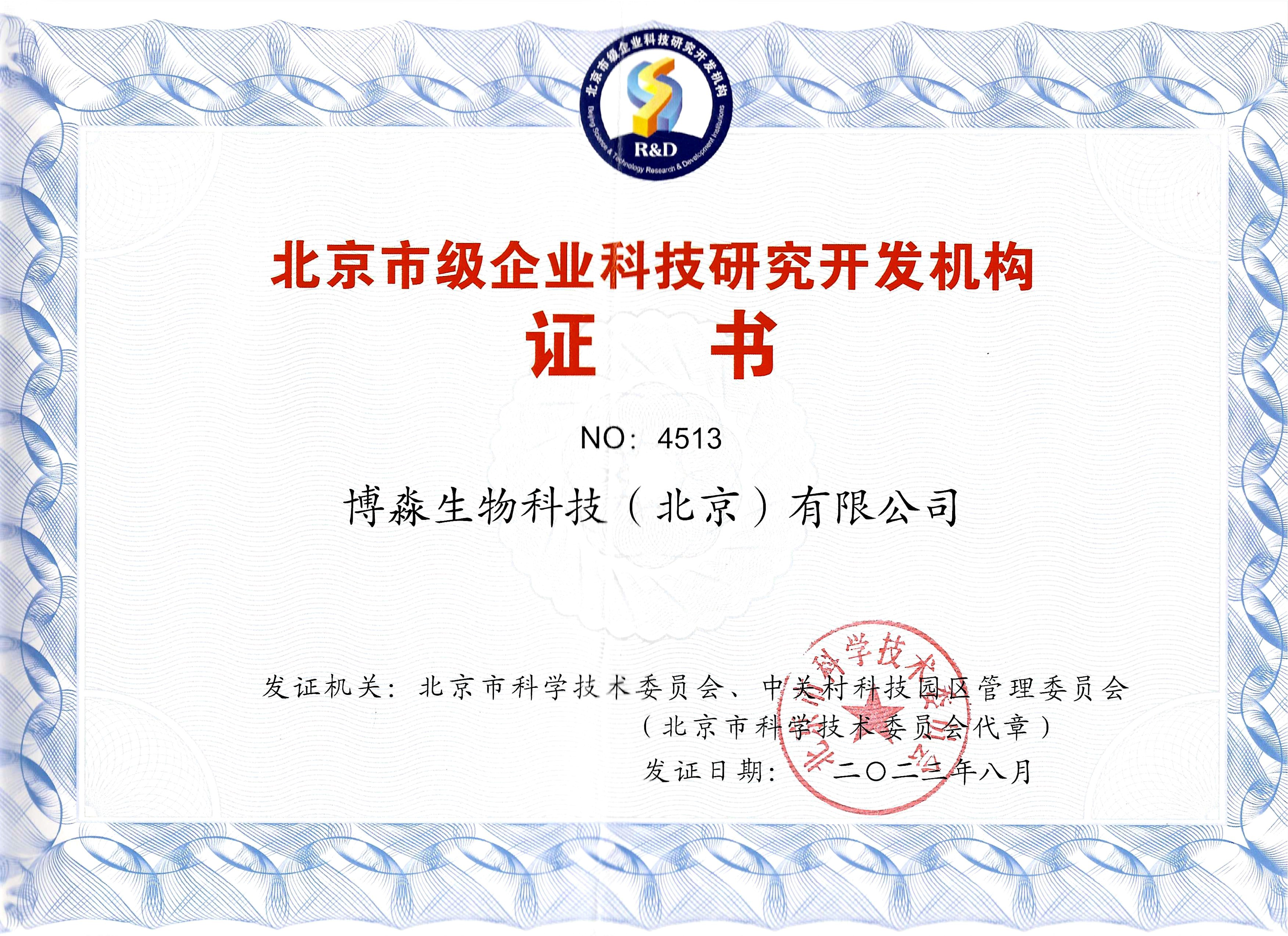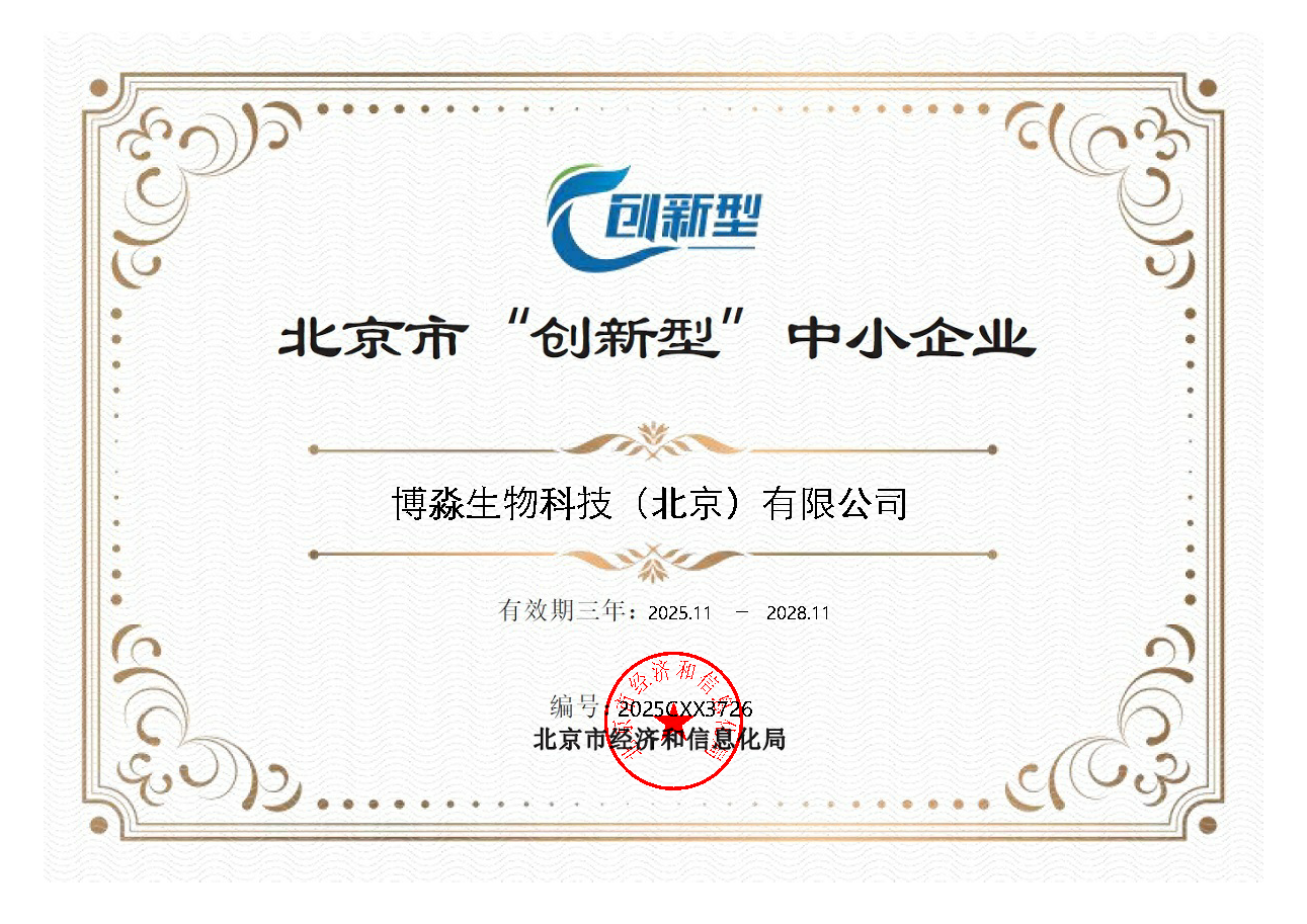 国家高新技术企业证书(博淼生物) 北京市级企业科技研发机构证书 北京市“专精特新”中小企业证书 北京市“创新型”中小企业